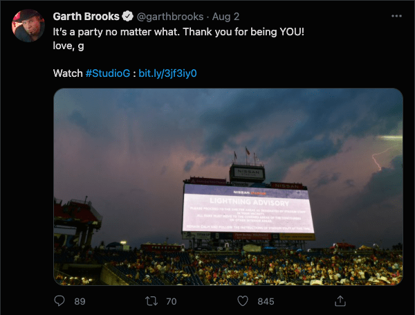 Garth Brooks (and/or his team) retweeted almost everything that Nissan Stadium tweeted, reaching even more people with the updated news about the concert. In the days following, Garth tweeted his StudioG episode, which gave more information about what was going on, along with praise for the way everything was handled. A new concert date was alluded to, but no date was officially given due to scheduling difficulties. You can watch the StudioG episode below.