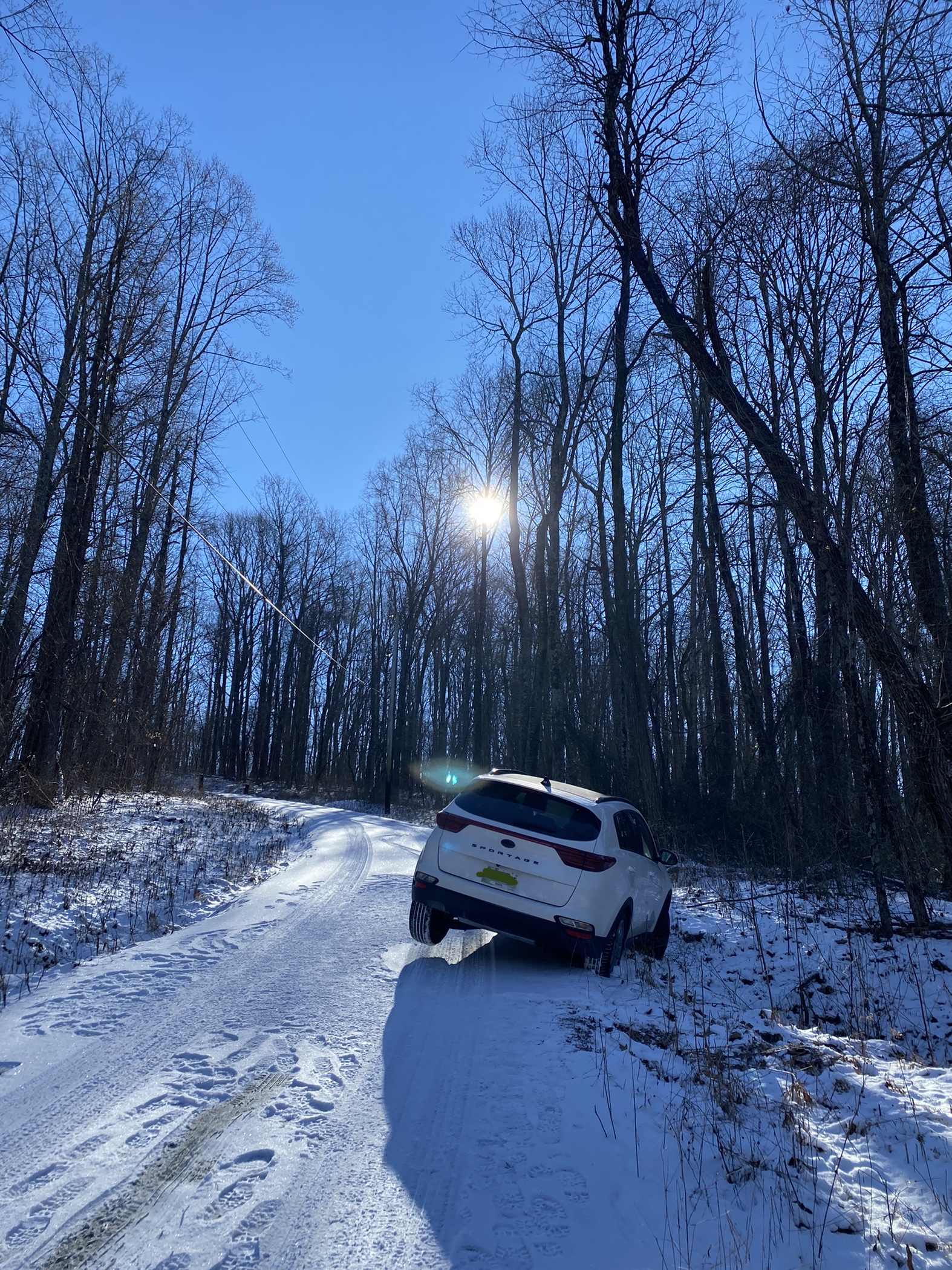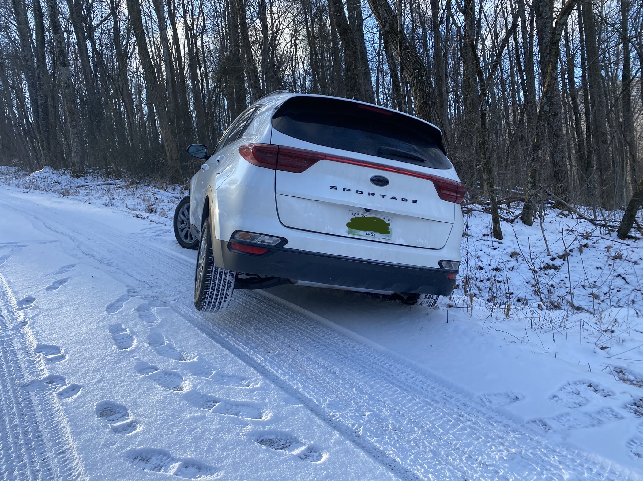 As I got off the exit at Crab Orchard, I noticed snow on the road. All the roads in that area are back roads, but I figured I would be ok since I was in an SUV and there was no ice (or so I thought). As I continued down the road, more and more snow covered the ground. I looked down at my instrument panel and the temperature had dropped from 25 degrees in Knoxville, to 12 degrees. So, my hike was going to be a bit colder than I expected, but I was prepared. I was layered up and I actually had hiking boots on instead of my Chacos. I finally reached the turn off onto Black Mountain road. The drive had been uneventful and absolutely beautiful. As I turned onto the road, I noticed that the incline was steep and I still had two miles until I reached the trailhead. But, I saw tire tracks in the snow so I felt it was safe to proceed. I kept slowly going up the hill, making sure to keep my tires in the fresh snow. I didnt make it far before my tires started spinning out and I started sliding backward down the hill. I remind calm, but I had no control over the direction the vehicle was moving. After multiple attempts at straightening the car up and trying to safely navigate it down the slippery slope, the 2021 Kia Sportage came to a rest on the side of the road.